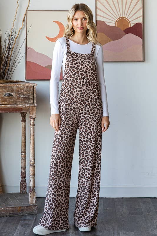 AN ANIMAL PRINT OVERALL JUMPSUIT FEATURING SIDE PATCH POCKETS, BUTTON IN STRAPS, OVERALL, WIDE LEG, AND A RELAXED FIT.