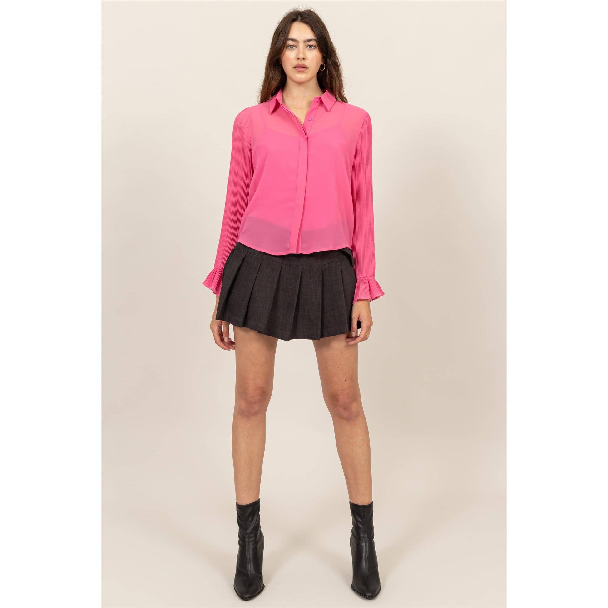 This Elegant Bell Sleeve Top Features Intricate Pleated Details On The Sleeves, Adding A Touch Of Sophistication To The Design. The Front View Showcases A Classic Collar And Button-Up Style, While The Back View Highlights The Flowing Fabric That Creates A Flattering Silhouette. With A Comfortable Inside Lining, This Top Ensures A Smooth And Secure Fit. Perfect For Both Casual And Formal Occasions, This Versatile Top Is A Must-Have Addition To Any Wardrobe. 100% Polyester Imported. Designed in the USA