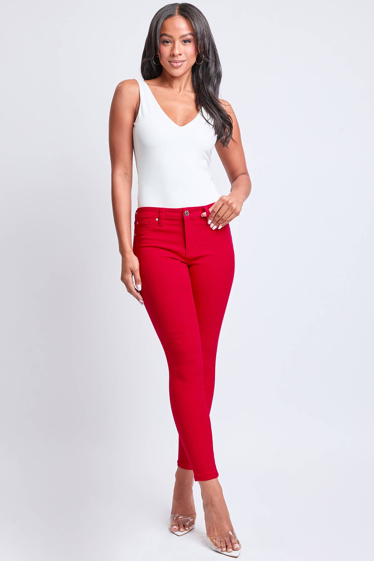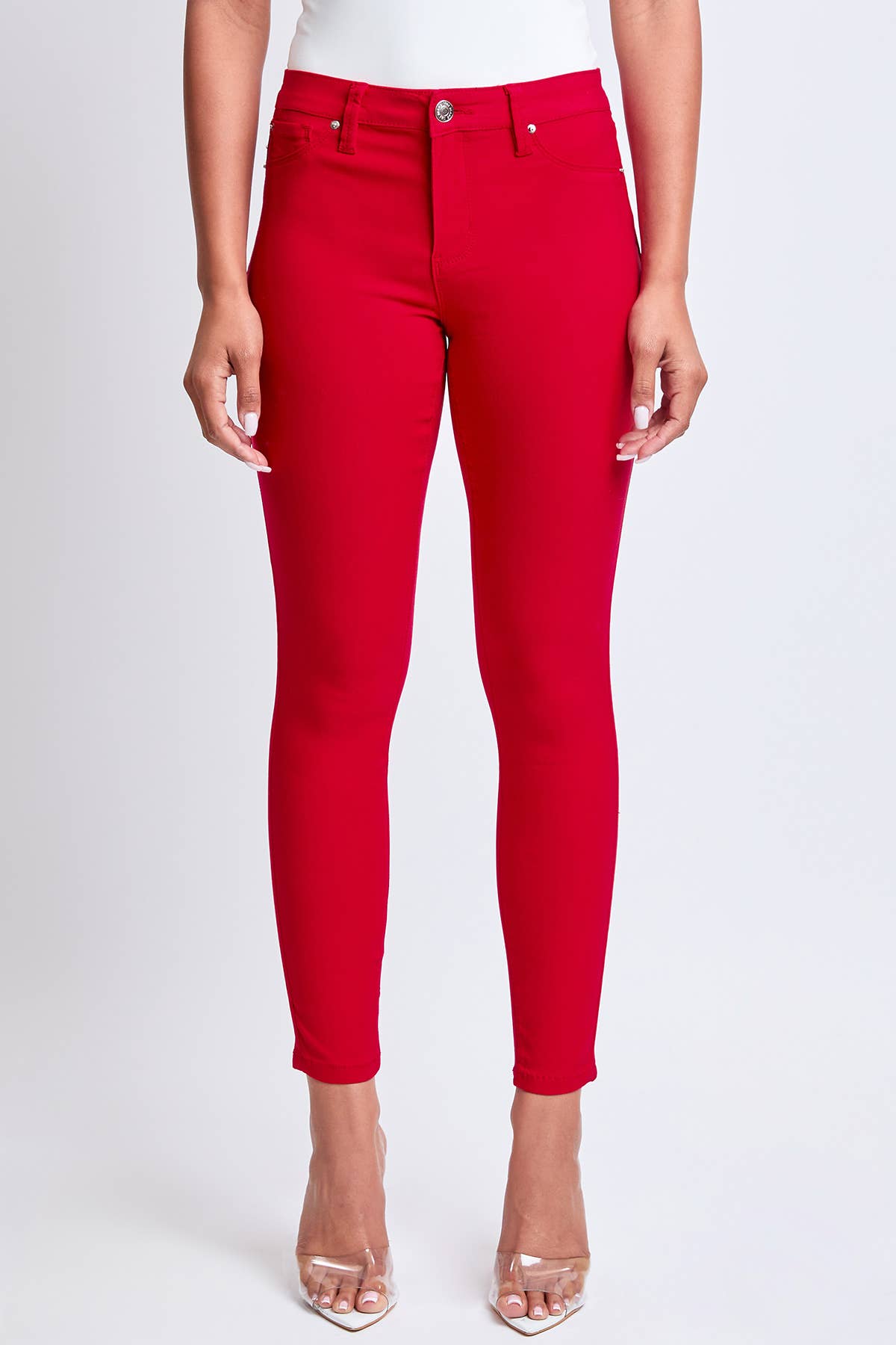 Literally, our best seller just got even better! Our Hyperstretch Forever Color Mid-Rise Skinny Jean has a sleek, mid-rise fit that features the softest and most flexible fabric, available in a variety of colors. Finished with faux front pockets, single-button with zip closure, and belt loops. This fabric has been improved to provide a stronger fixation, resulting in greater color fastness, making the fabric withstand more wear and washes. This is why we named this pant, Forever Color: it will be forever yours. Measurement (Based on size S) - Inseam: 30” - Rise (To top edge of band): 9” - Leg Opening: 9” Composition - 77% RAYON/ 21% NYLON/ 2% SPANDEX • Hand wash cold. Dry Flat. Warm Iron if needed. • Model is wearing a size S.