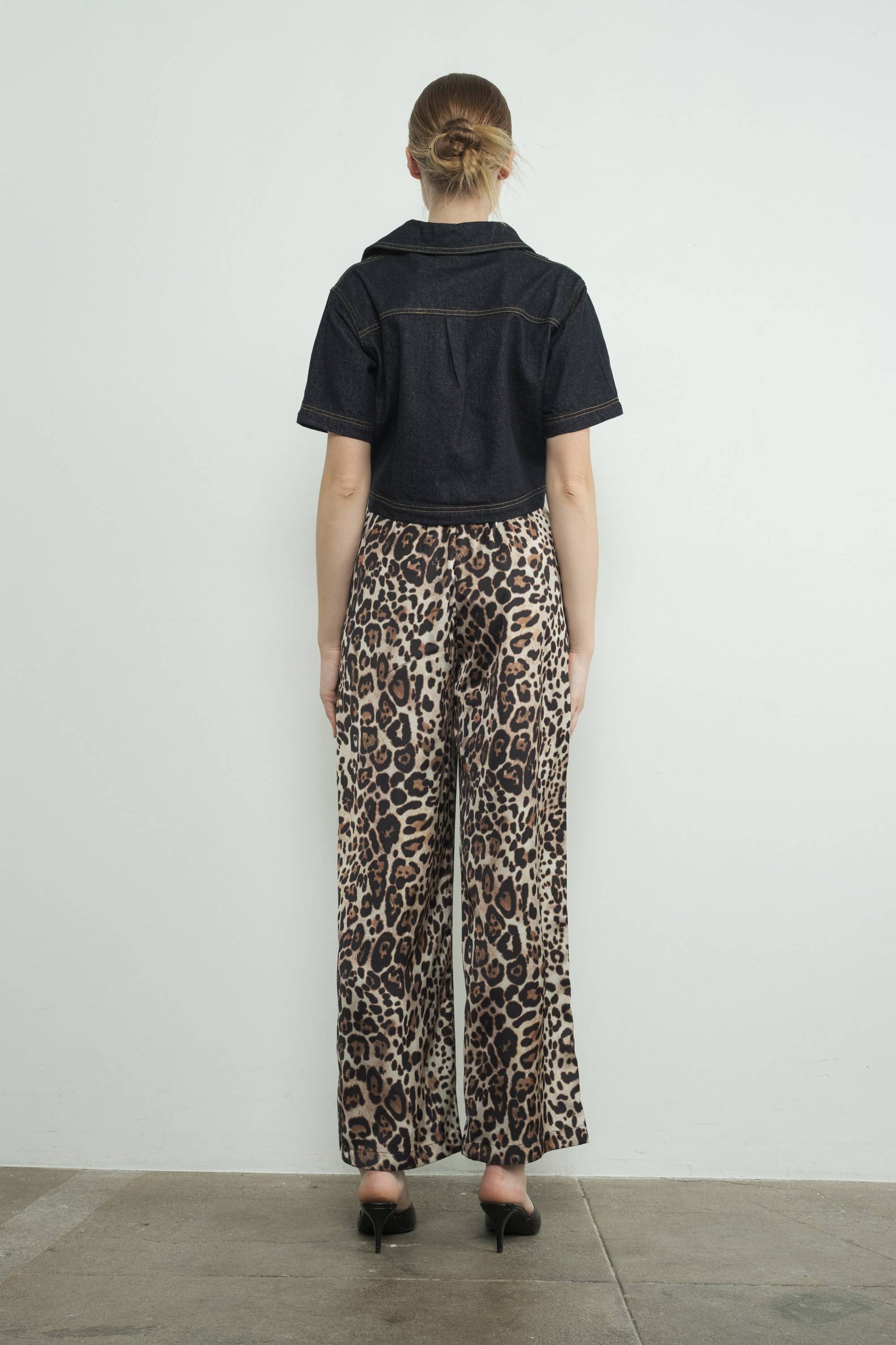 This Satin pants fearues all over animal print. Pants with a high waist and back elastic waistband. Front pockets. Wide leg. Front zip, interior button and hook closure.