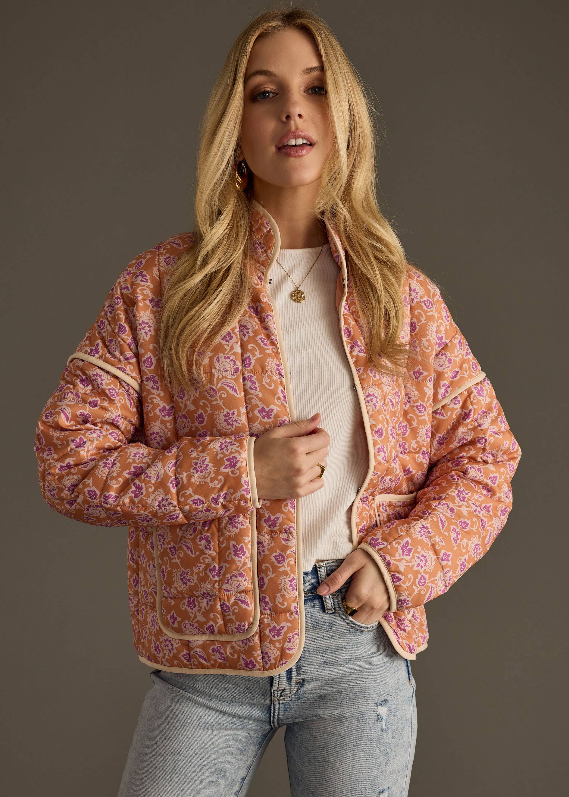 Orange, purple & cream patterned quilted jacket Clasp closure Two front pockets 100% Polyester